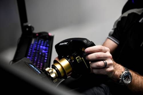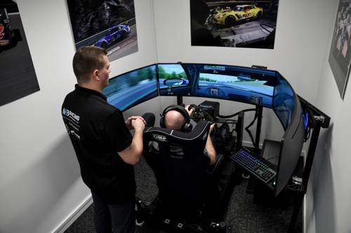 - Professionelt simulatorsetup med feedback i chassis, rat og pedaler samt 360-graders-view-fornemmelse